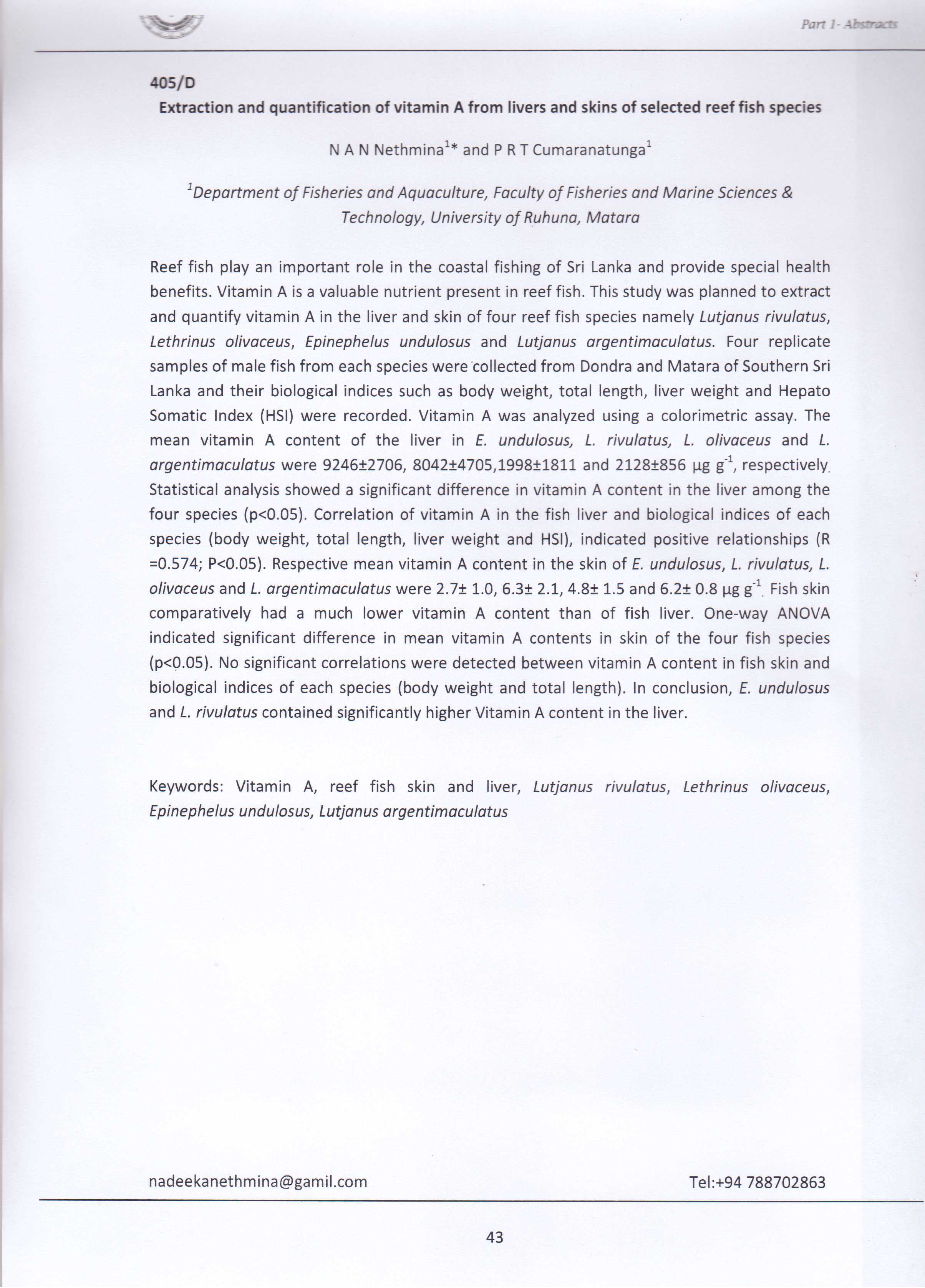 Nethmina, N.A.N. and Cumaranatunga, P.R.T. (2016). Extraction and quantification of vitamin A from livers and skins of selected reef fish species. Sri Lanka ...