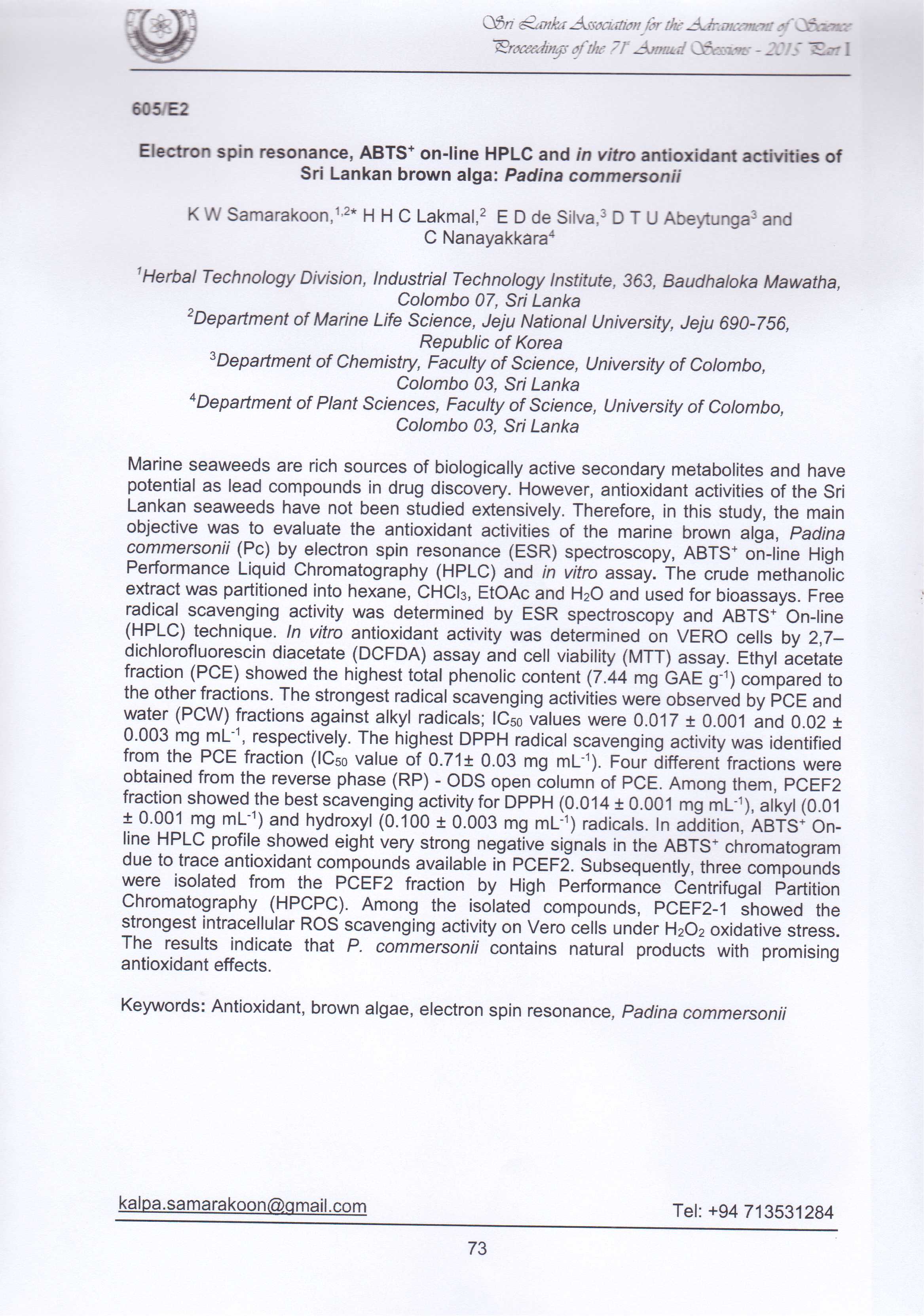 "Samarakoon, K.W. Lakmal,H.H.C. De Silva, E.D. Abeytunga, D.T.U. and Nanayakkara,C. (2015). Electron spin resonance, ABTS on-line HPLC and in vitro antioxi...