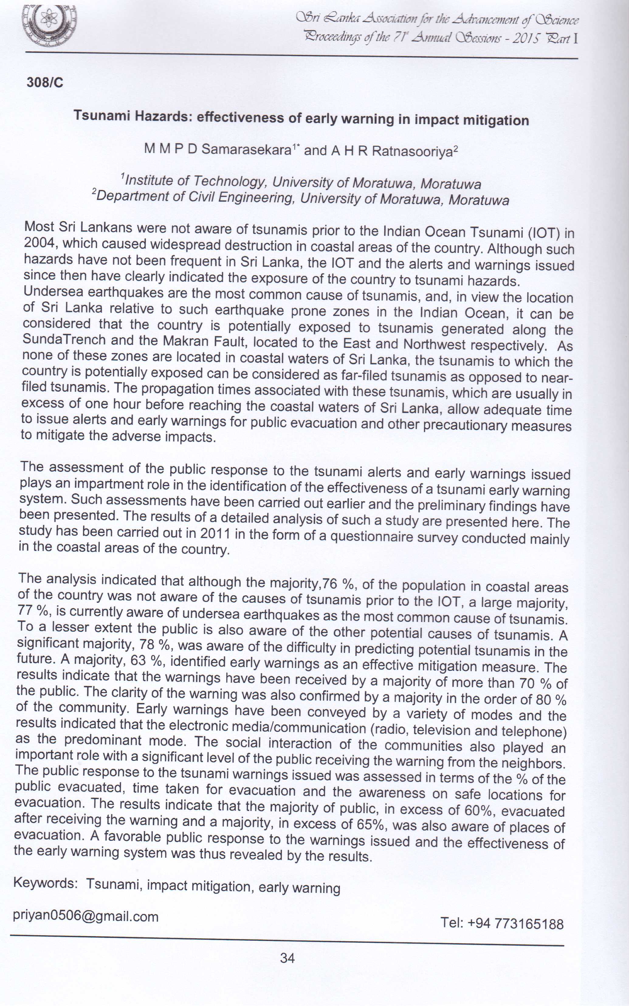 Samarasekara, M. M. P. D. and Ratnasooriya, A.H.R. (2015). Tsunami Hazards: effectiveness of early warning in impact mitigation. Sri Lanka Association for t...