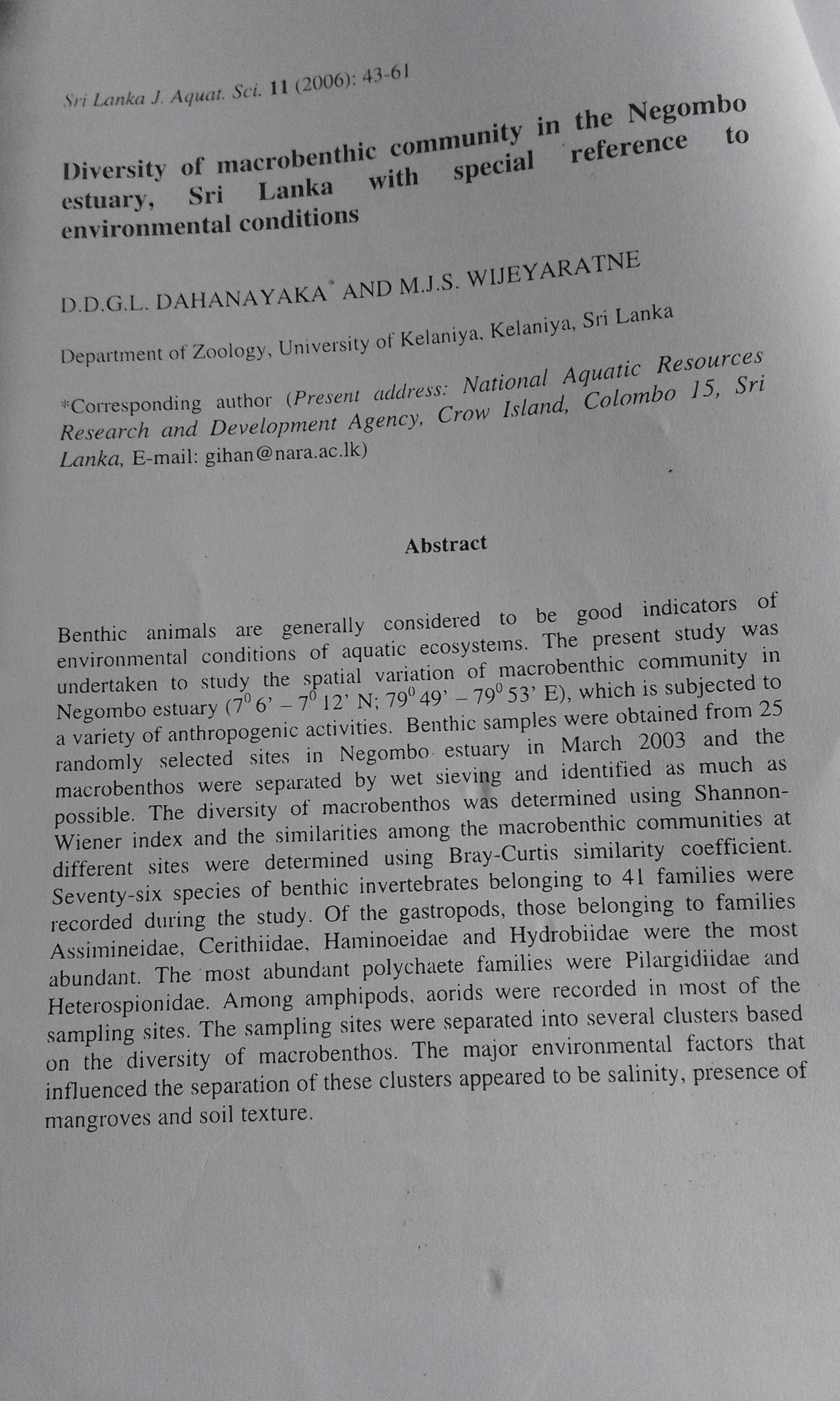 Dahanayaka, D.D.G.L. and Wijeyaratne M.J.S.2006.Diversity of macrobenthic community in the Negabo estuary, Sri Lanka with special reference to environmental ...