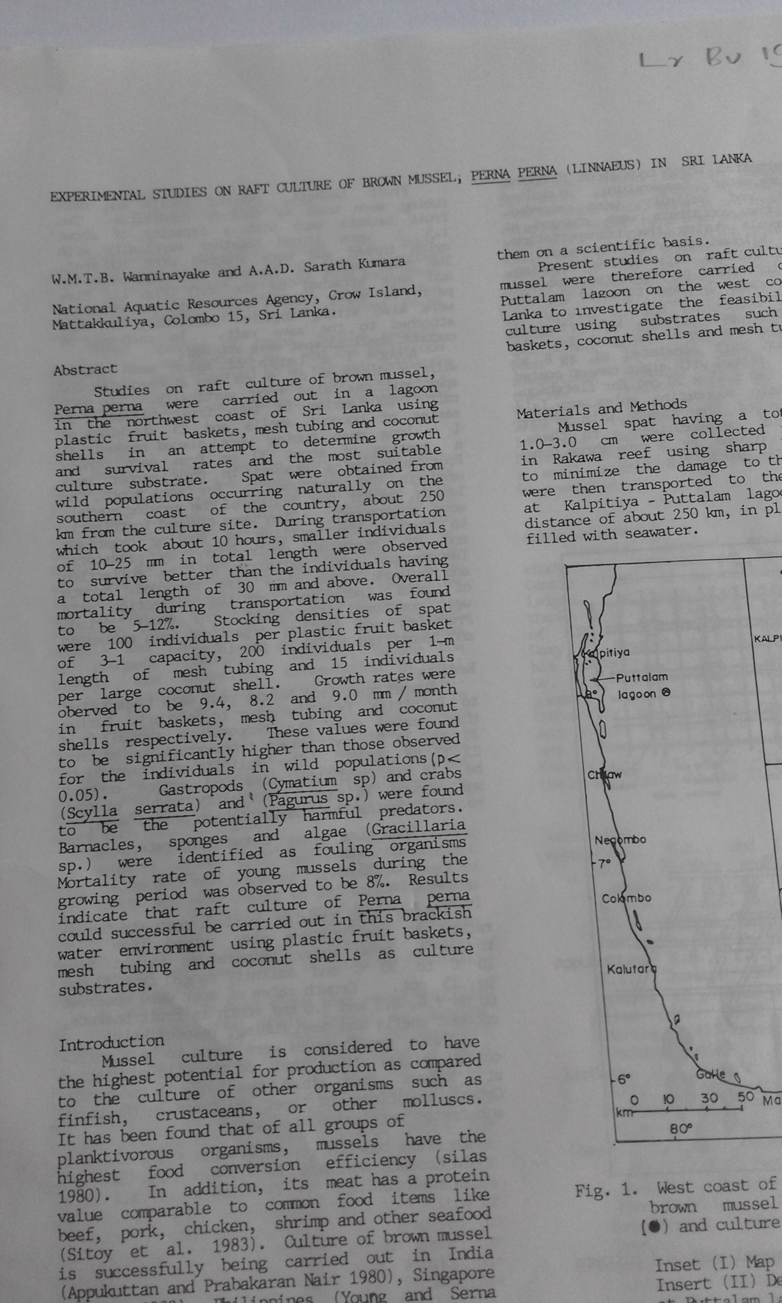 Wanninayake W.M.T.B and Sarath Kumara A.A.D.(1990).Experimental studies on raft culture of brown mussel ,Perna perna (Linnaeus) in Sri Lanka.The second Asian...