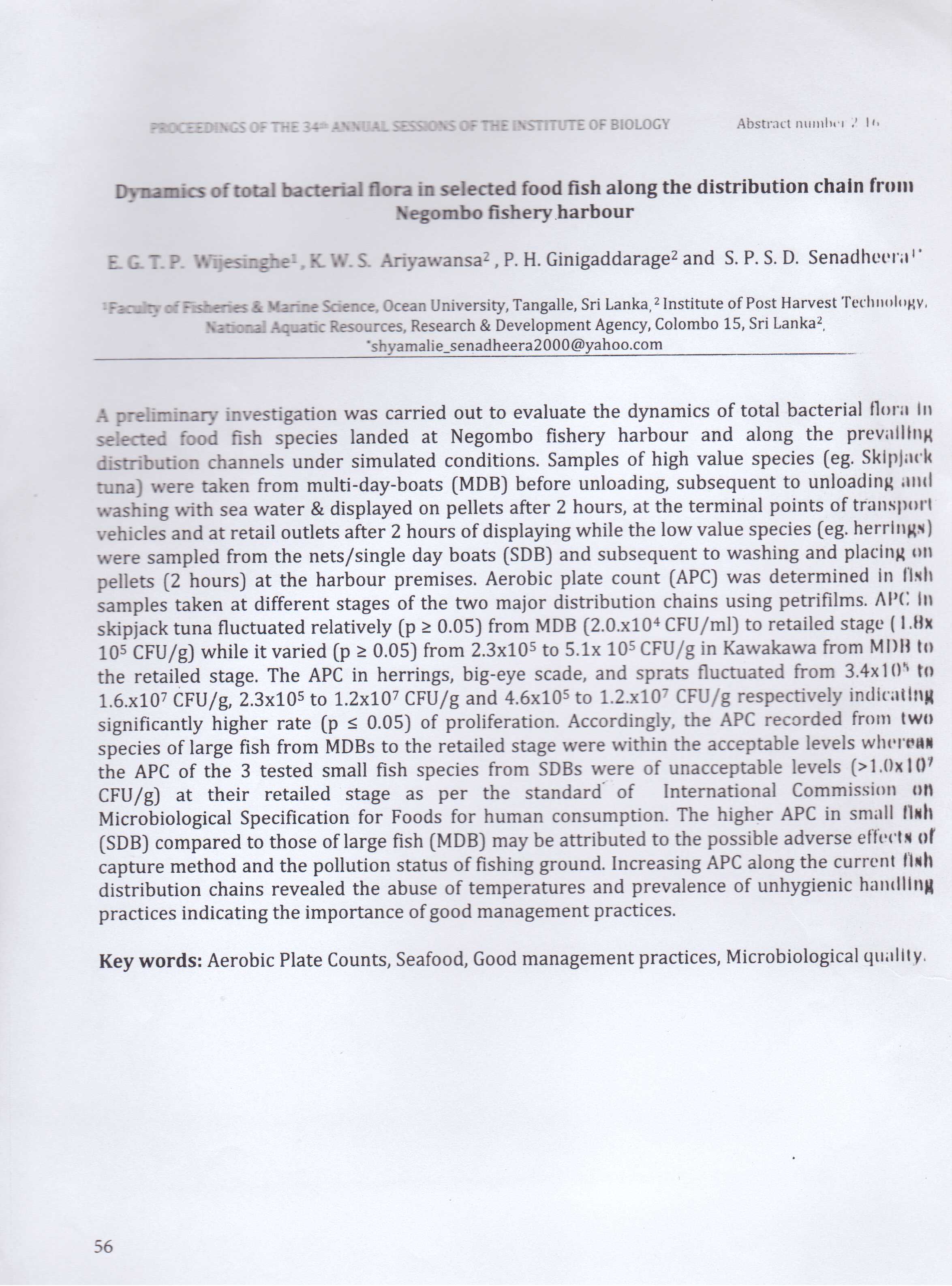 Wijesinghe, E.G.T.P. Ariyawansa,K.W.S. Ginigaddarage, P.H. and Senadheera, S.P.S.D. (2014). Dynamics of total bacterial flora in selected food fish along...