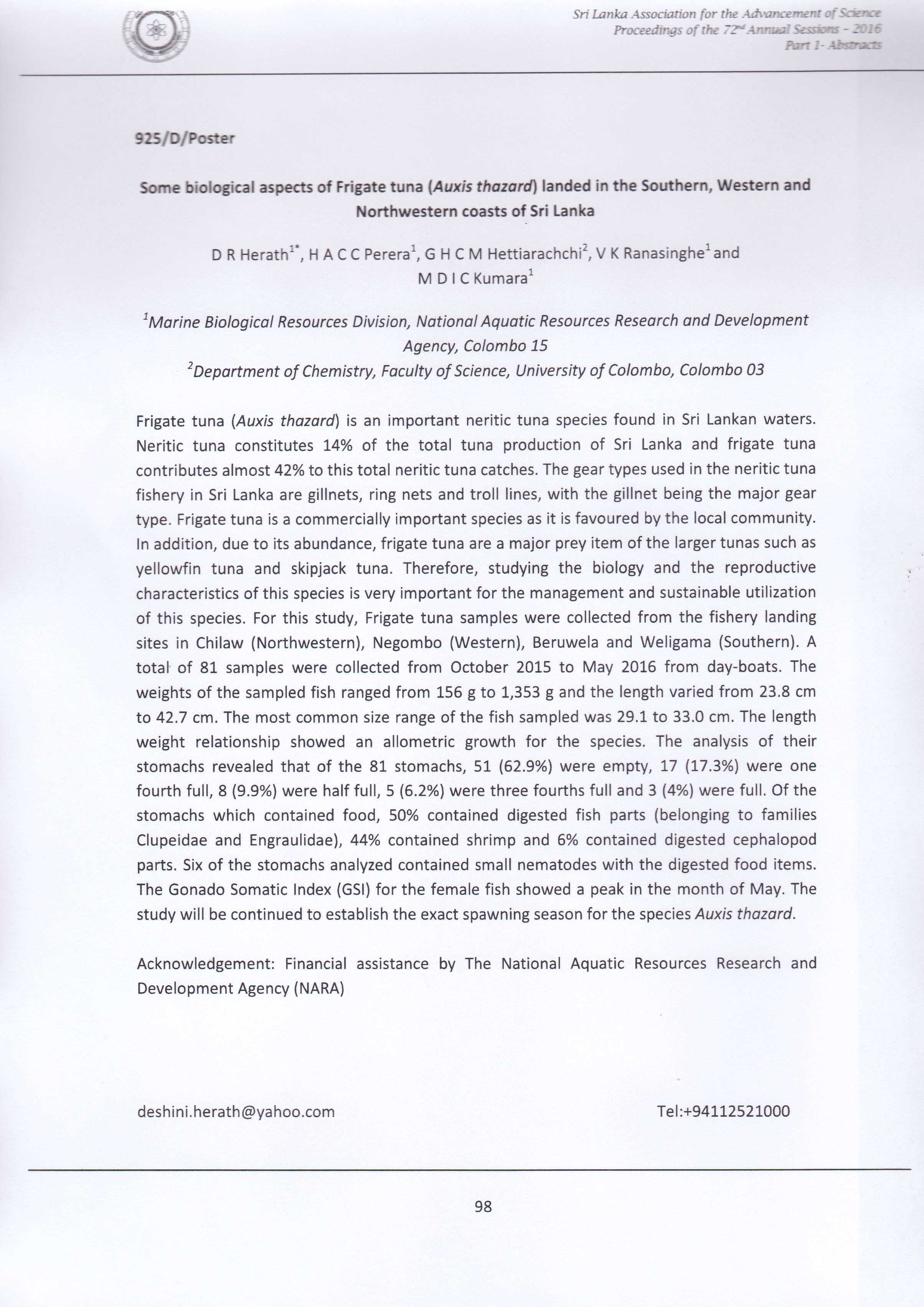 Herath, D.R. Perera,H.A.C.C. Hettiarachchi, G.H.C.M. Ranasinghe, V.K. and Kumara, M.D.I.C. (2016). Some biological aspects of Frigate tuna (Auxis thazard)...